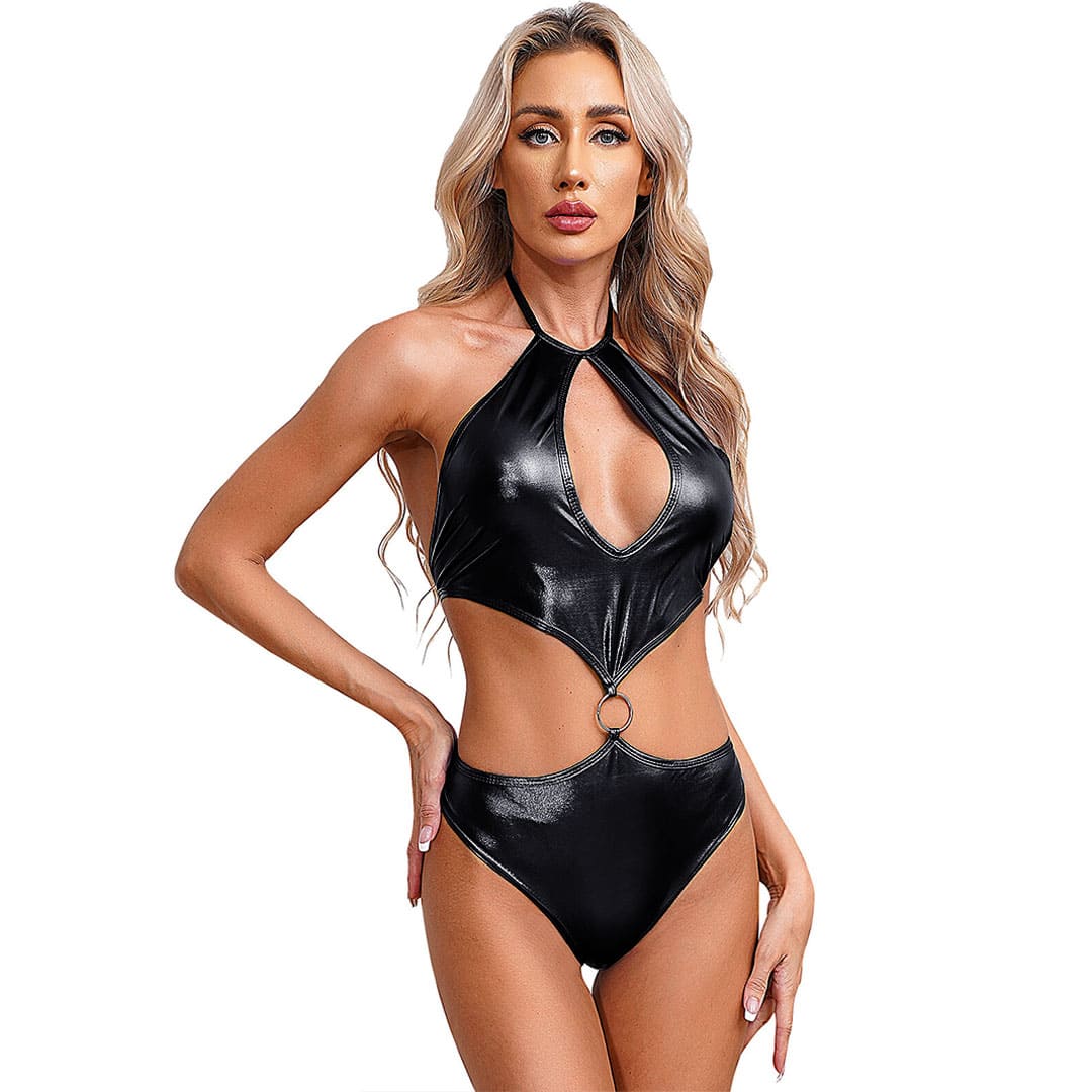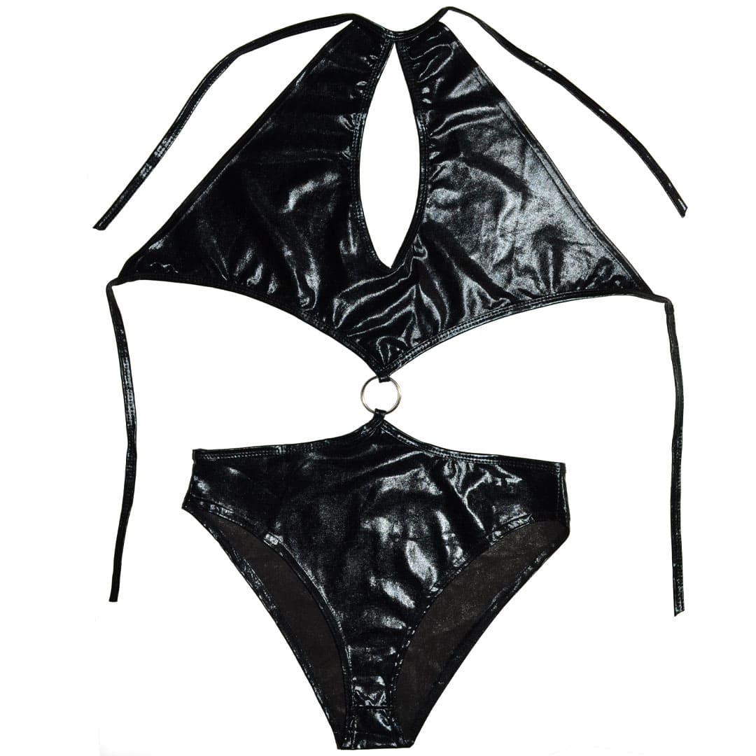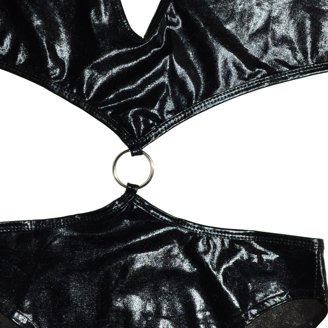 Блискучі боді металік (з диско-трикотажу, біфлекс з напиленням) через шию, в області горловини великій краплі образні виріз, зав'язується ззаду в ділянці грудей, верхня частина і труси з'єднані спереду металевим кільцем, внизу труси сліпи.