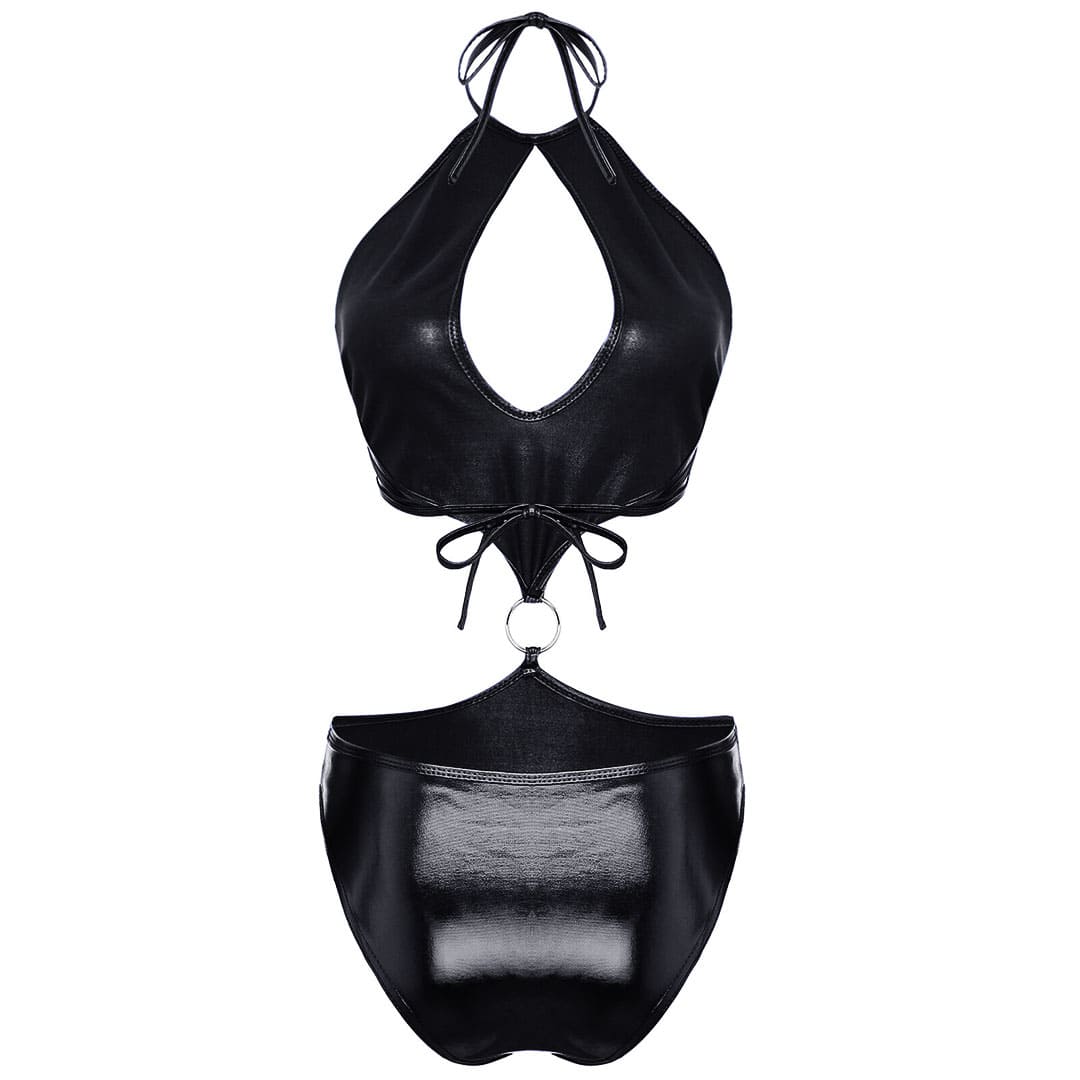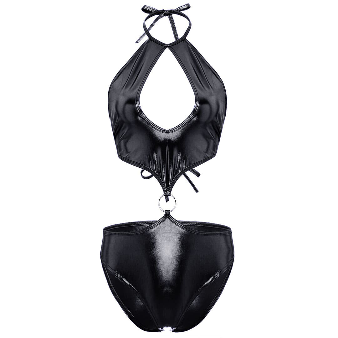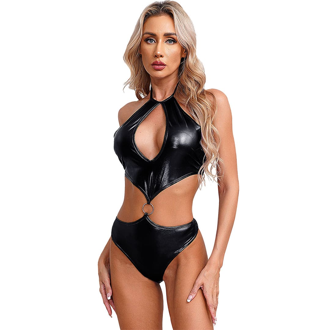 Блискучі боді металік (з диско-трикотажу, біфлекс з напиленням) через шию, в області горловини великій краплі образні виріз, зав'язується ззаду в ділянці грудей, верхня частина і труси з'єднані спереду металевим кільцем, внизу труси сліпи.