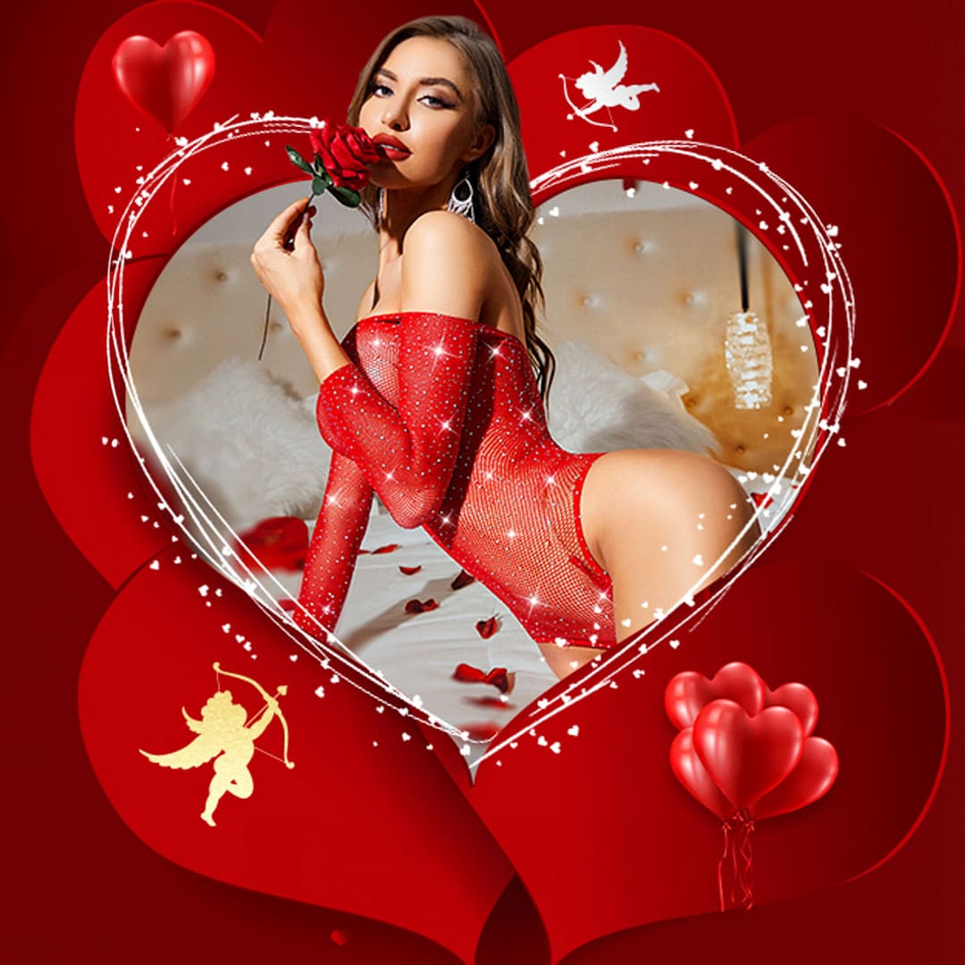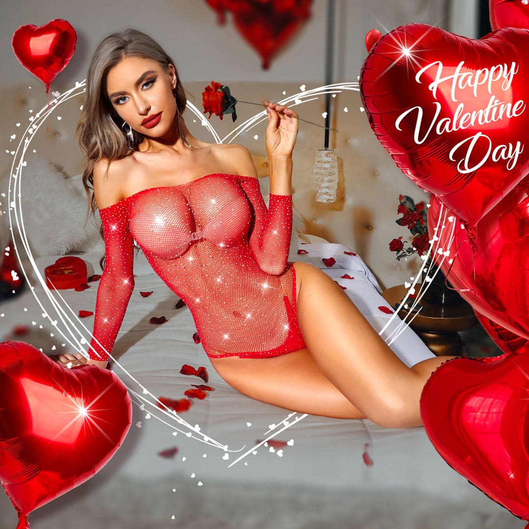 Еротичний червоний прозорий Боді "Сітка" (ігровий костюм, костюм для рольових ігор) у дрібну сіточку з приклеєними стразами, довгі рукави та широкий круглий виріз горловини спереду та ззаду (можна носити з відкритими плечима), ззаду труси – сліпами.