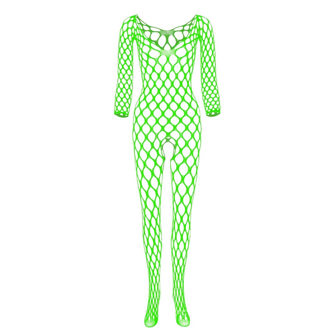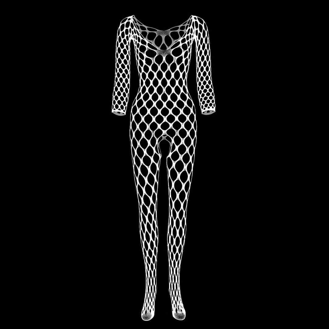 Еротичний прозорий БодіСтокінг білий, що світиться в темряві салатовим (Боді комбінезон Сітка, ігровий костюм, костюм для рольових ігор) у велику круглу сітку з ефектом люмінесценції (накопичує світло а потім світитися в темряві), V-подібний виріз горловини спереду і ззаду, рукав три чверті, по центру ластавніци (в паху) розріз.