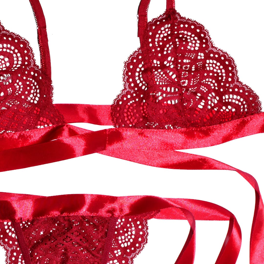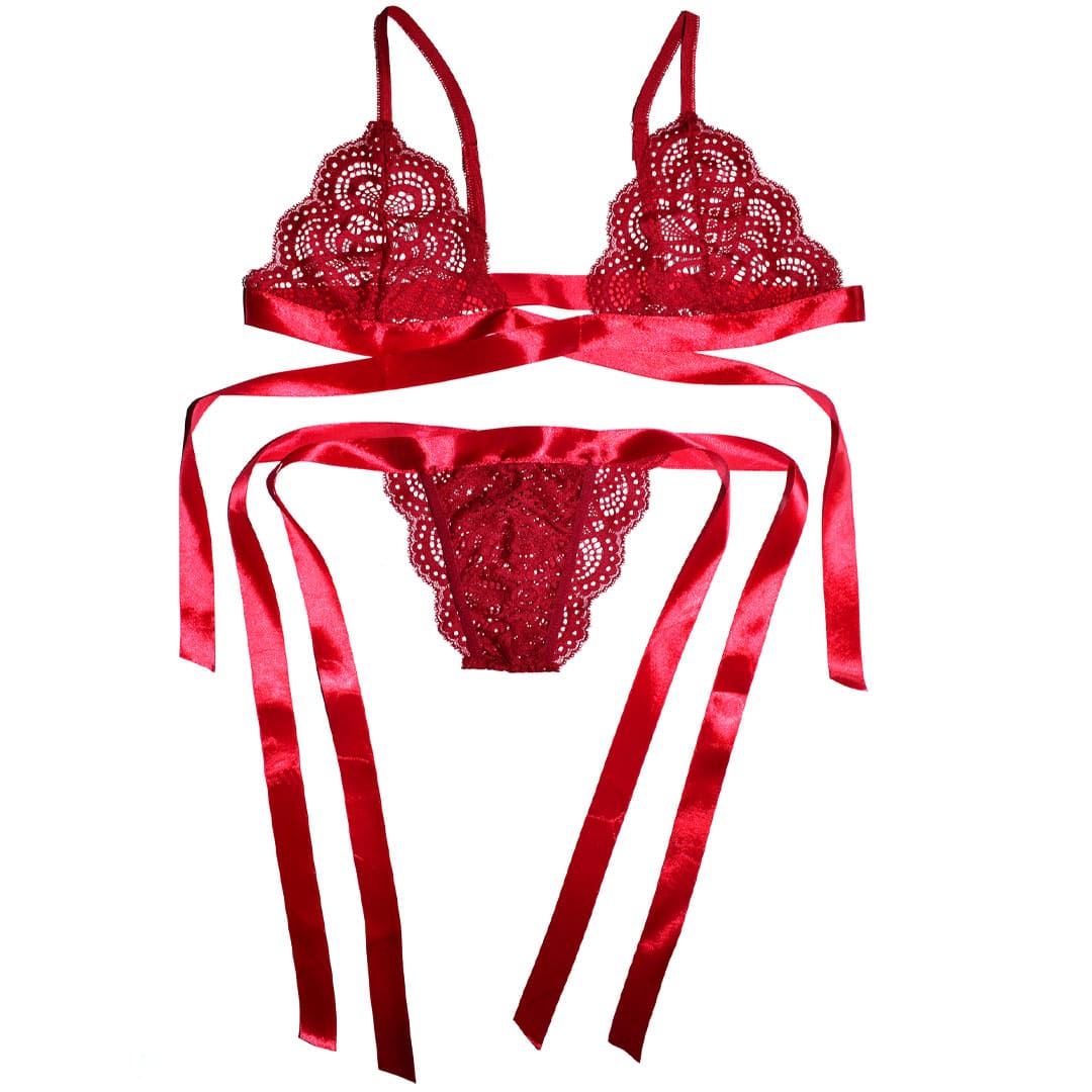 Бюстгальтер з трикутними чашками на тонких бретельках, що регулюються, під грудьми атласна стрічка з довгими зав'язками спереду.