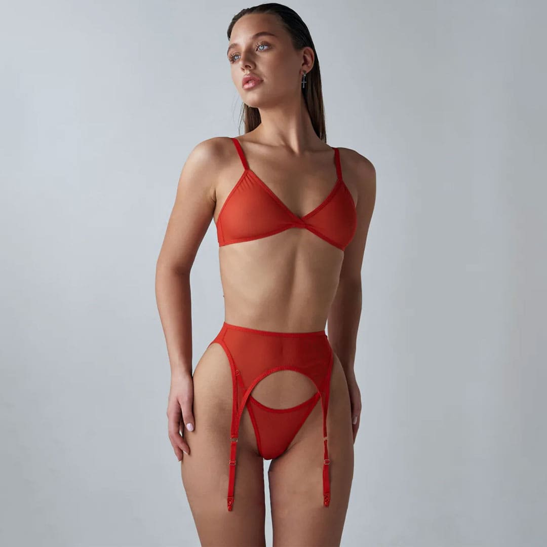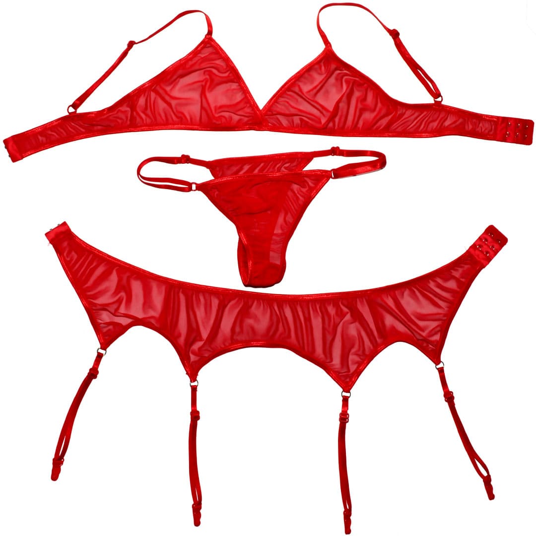 Червоний напівпрозорий еротичний комплект (ігровий костюм, костюм для рольових ігор): бюстгальтер, труси та пояс.
