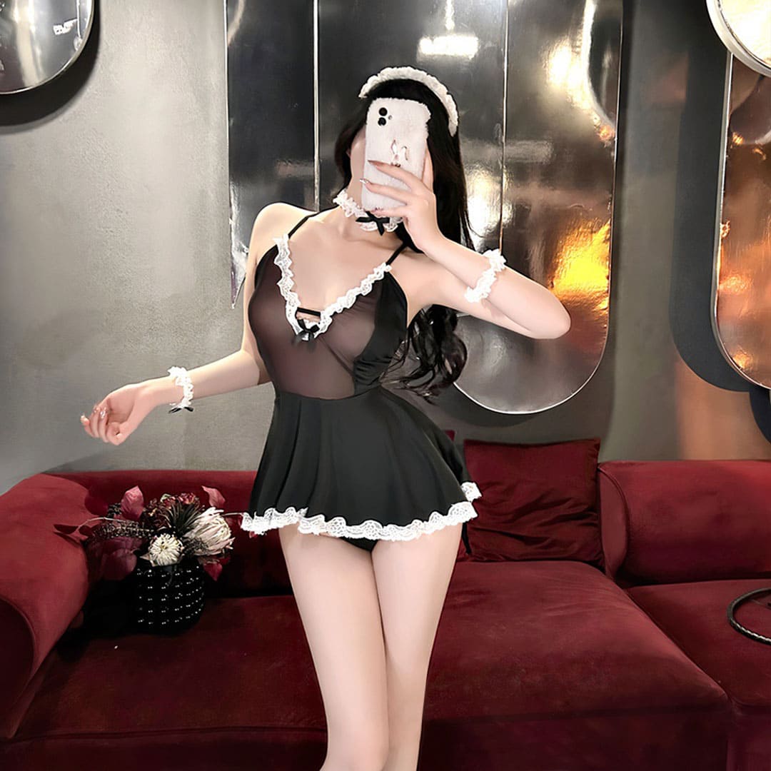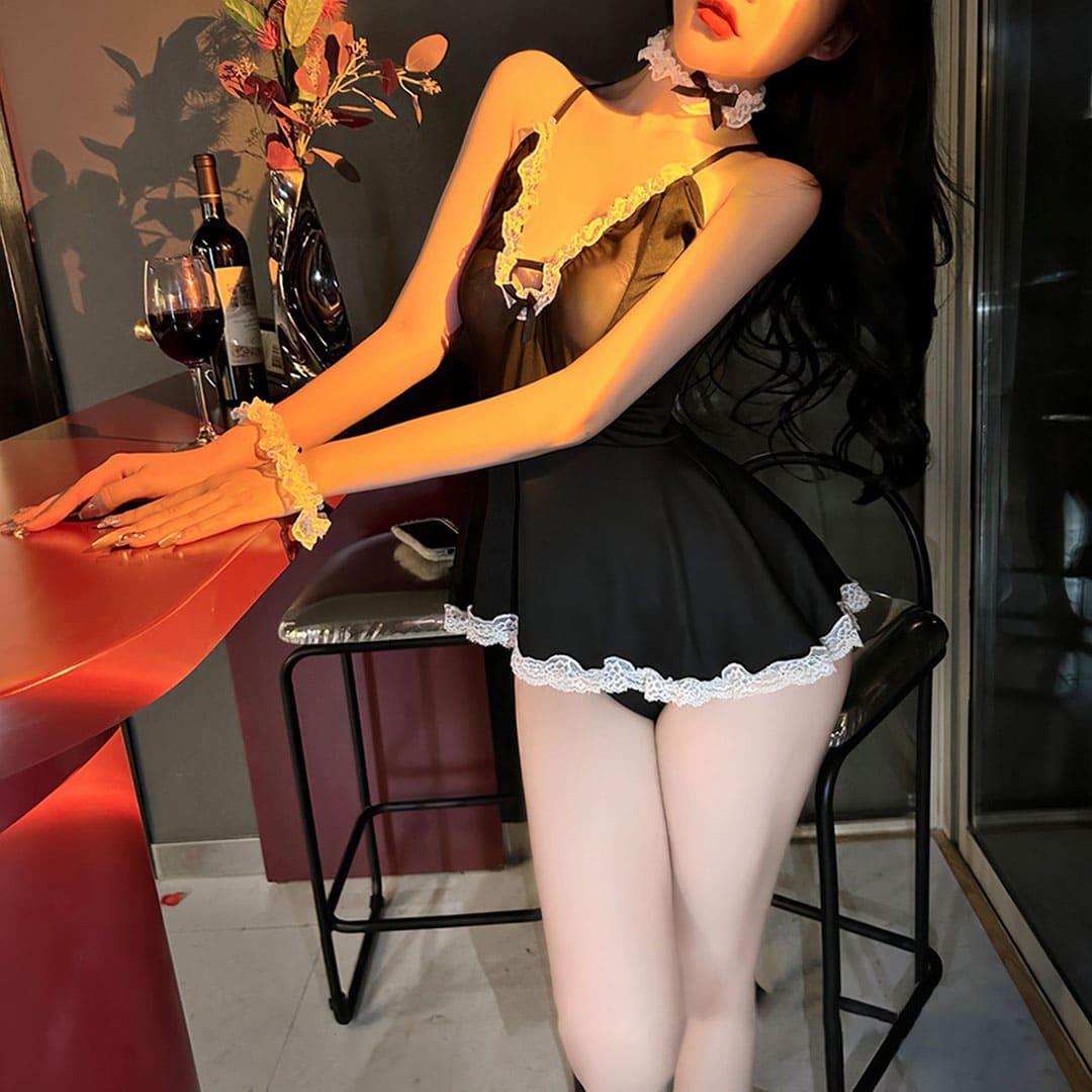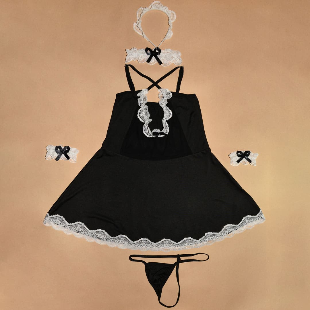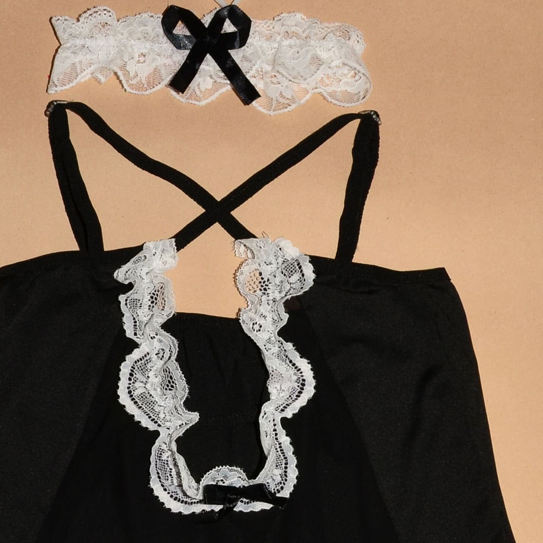 Еротичний ігровий костюм "Покоївка" (костюм для рольових ігор): пеньюар, труси, манжети, чокер/підв'язка, обідок на голову.