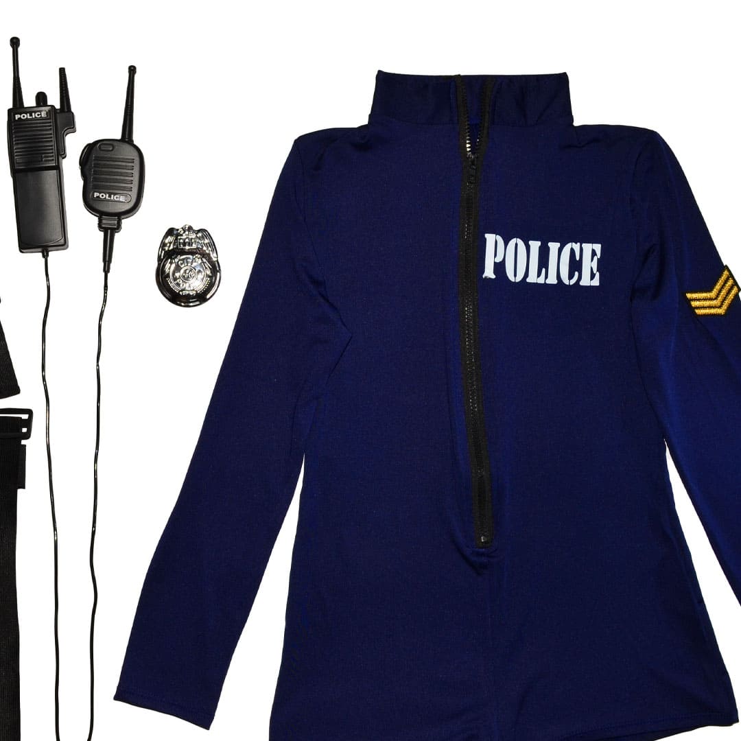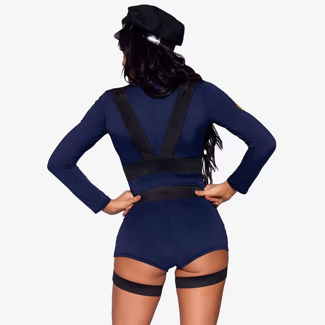 Темно-синій еластичний боді-комбінезон з довгими рукавами та коміром стійка на блискавці вище за талію, прикрашений білим написом "Police" та шевроном на рукаві, низ міні-шортиками.
