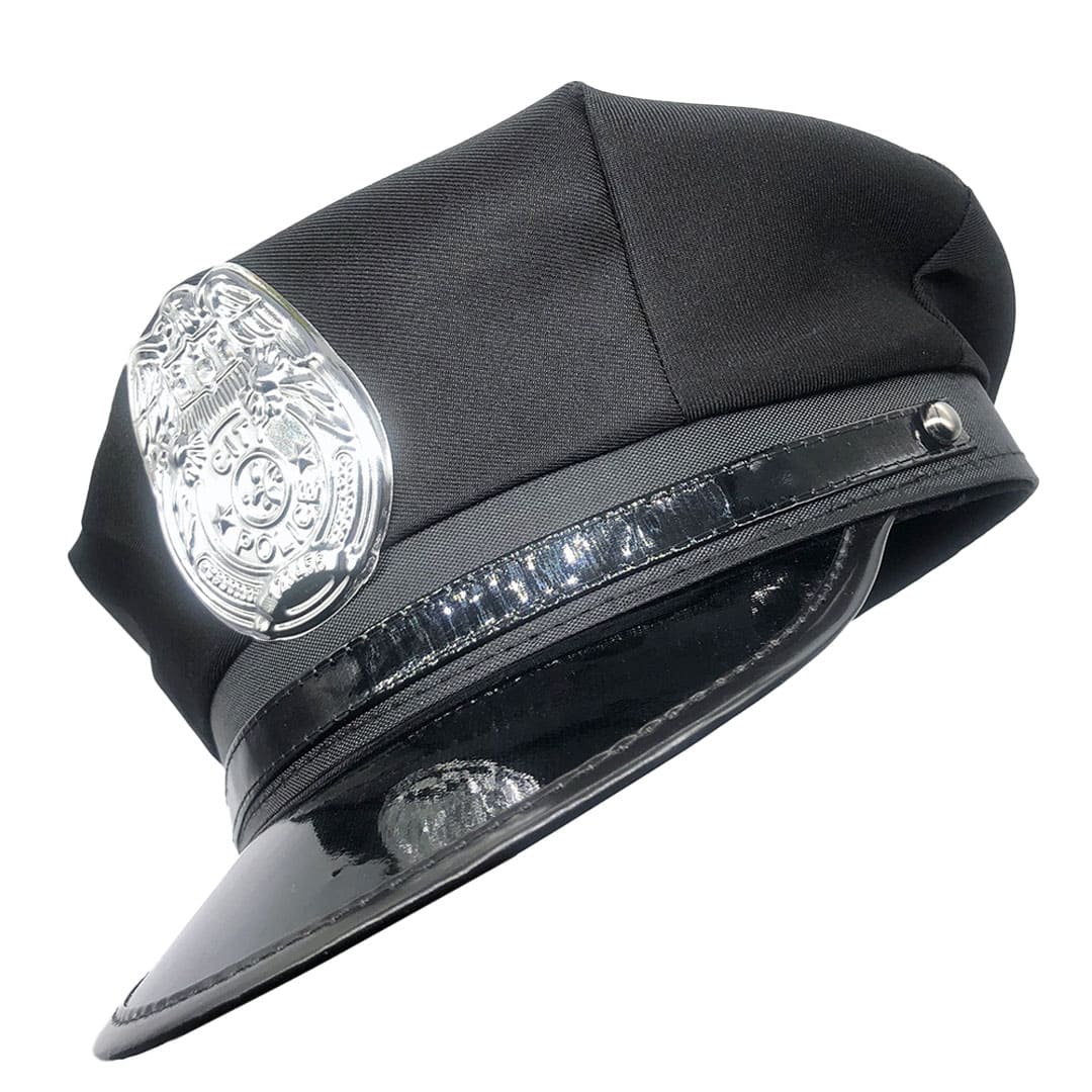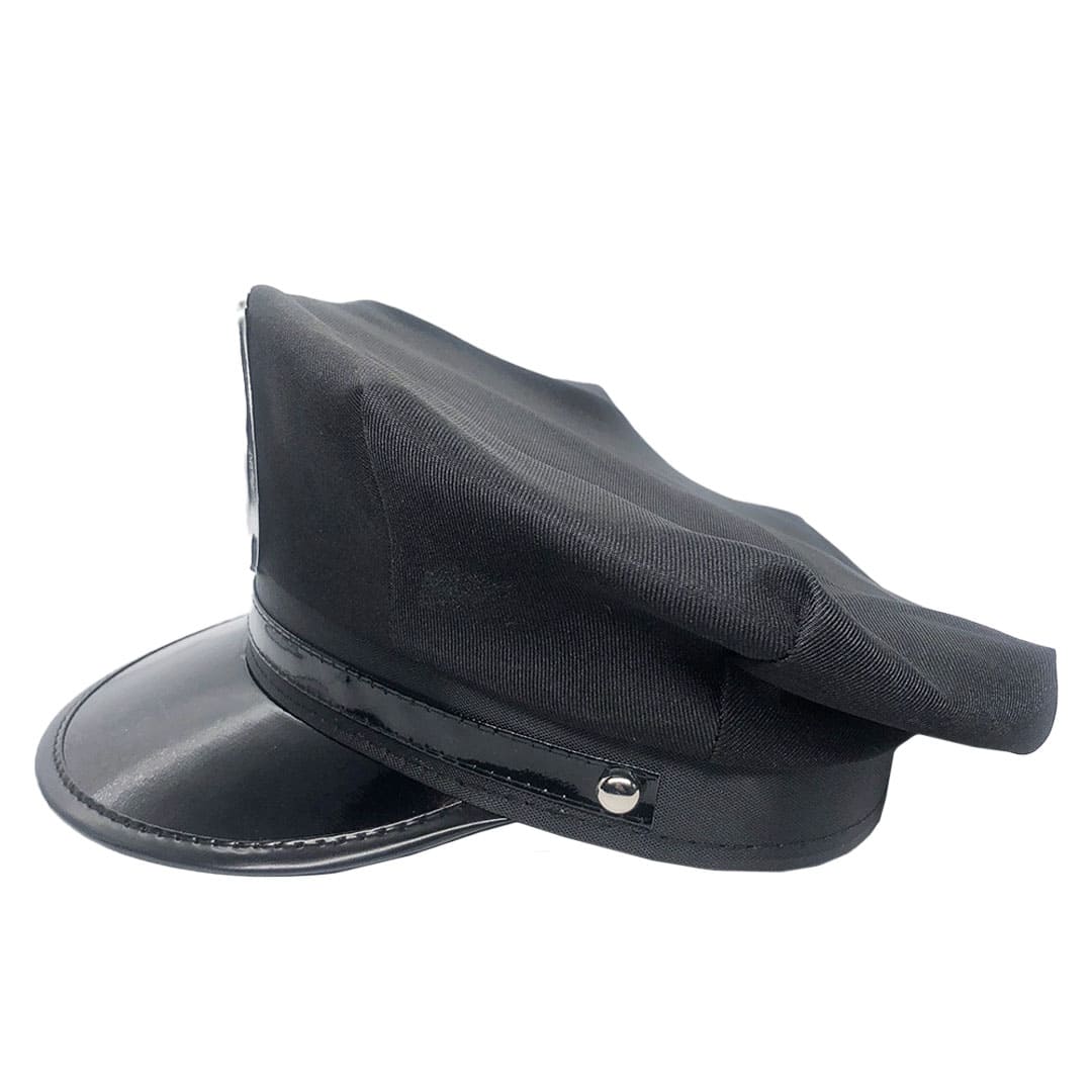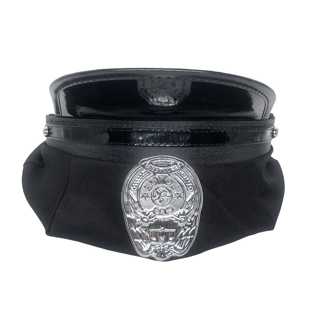 Чорний кашкет "Поліцейської" до ігрового костюма "Поліцейської" (костюму для рольових ігор) з двостороннім лаковим козирком та приклеєною пластиковою сріблястою емблемою (кокардою) з написом "City Police" (Міська поліція) прикрашена декоративним лаковим ременем (рантом) над козирком. Усередині ущільнений налобник, вшитий напівкруглий ущільнювач в області емблеми та пластикова трубка для формування круглої форми донця зверху (тулья без підкладки).