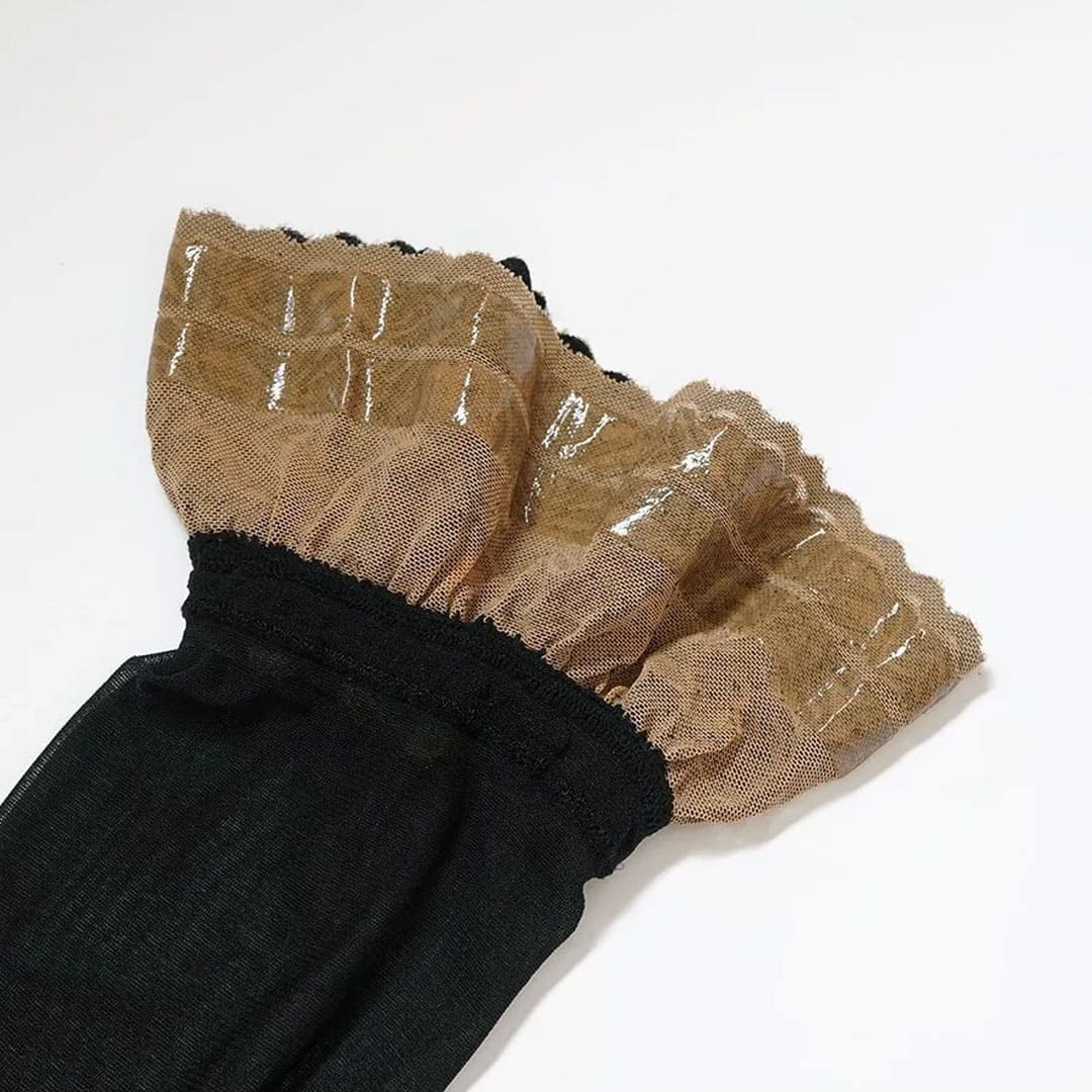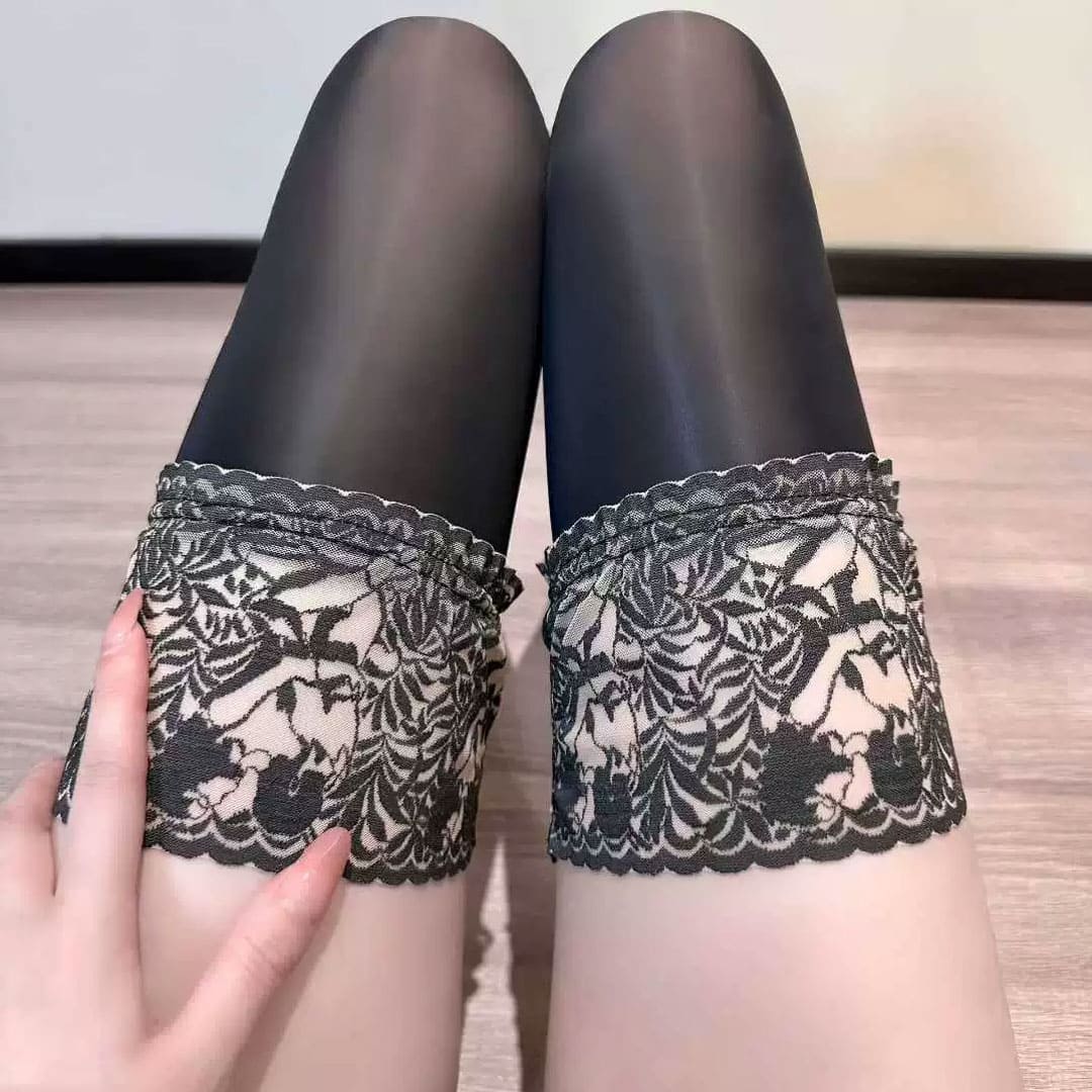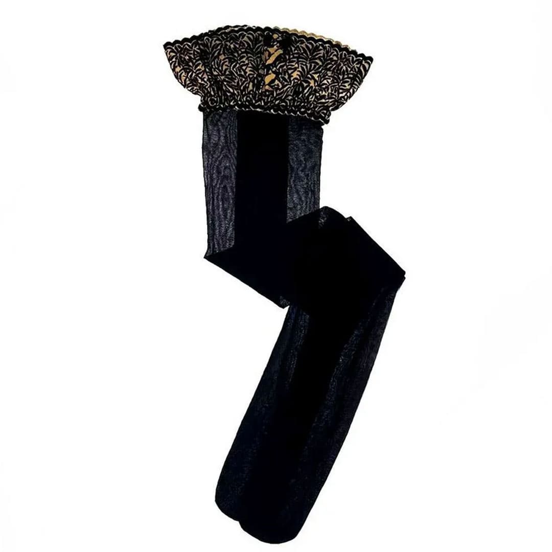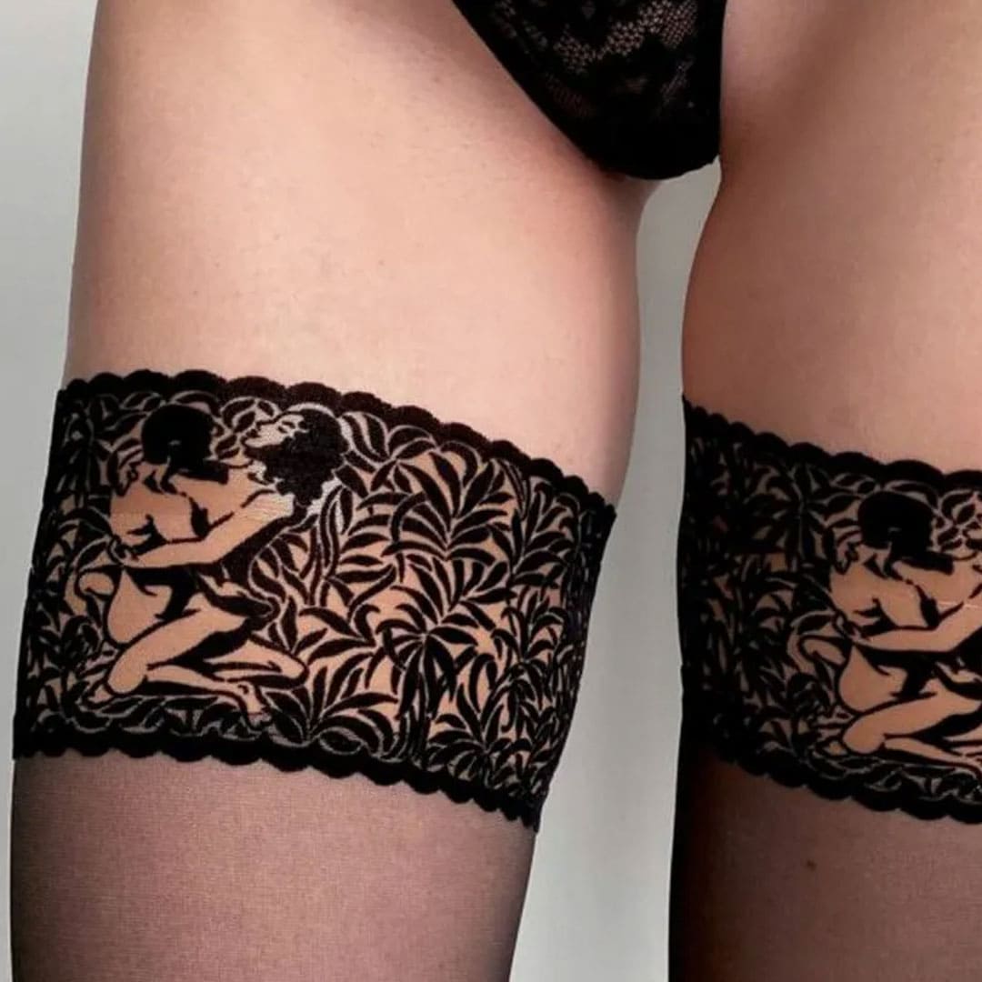 Чорні шовковисті самопідтримуючі панчохи з широким мереживним верхом — витончений аксесуар для створення спокусливого образу. На внутрішній стороні мережива розміщено дві силіконові смужки, які забезпечують надійну фіксацію без пояса. Невидимий мисок дозволяє носити їх із будь-яким взуттям. Особлива деталь — делікатний малюнок у вигляді пари, що кохається, додає панчохам еротичності та інтриги.