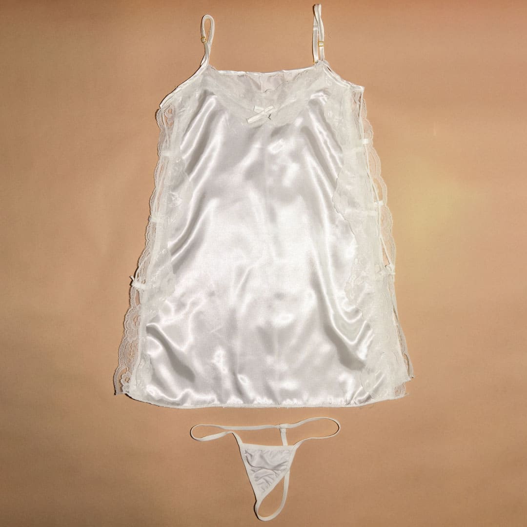 Білий еротичний комплект (костюм для рольових ігор): пеньюар та труси.