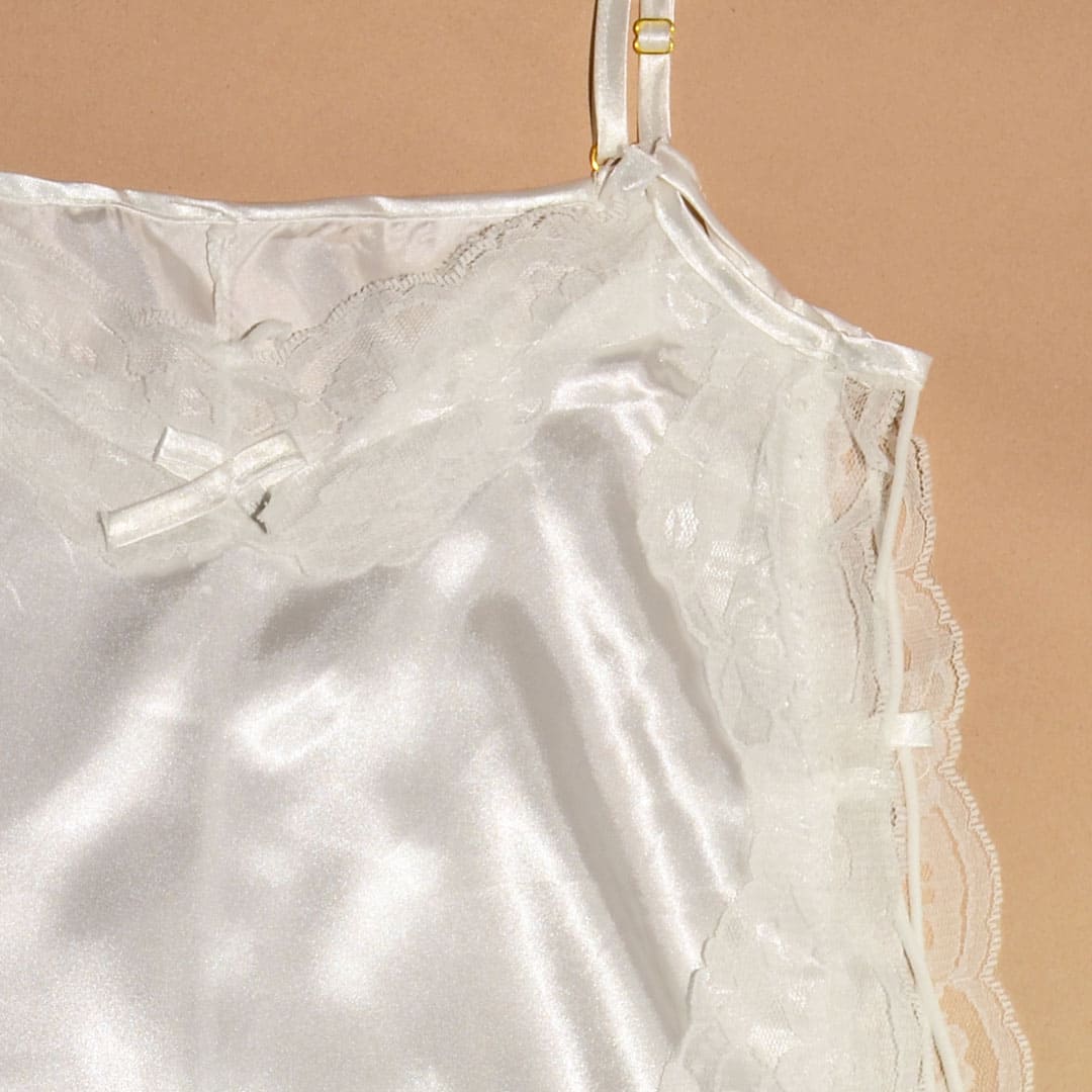 Короткий атласний пеньюар на тонких бретельках, що регулюються, по верху і бокам широке мереживо, передня і задня частина з'єднуються шнурівкою.