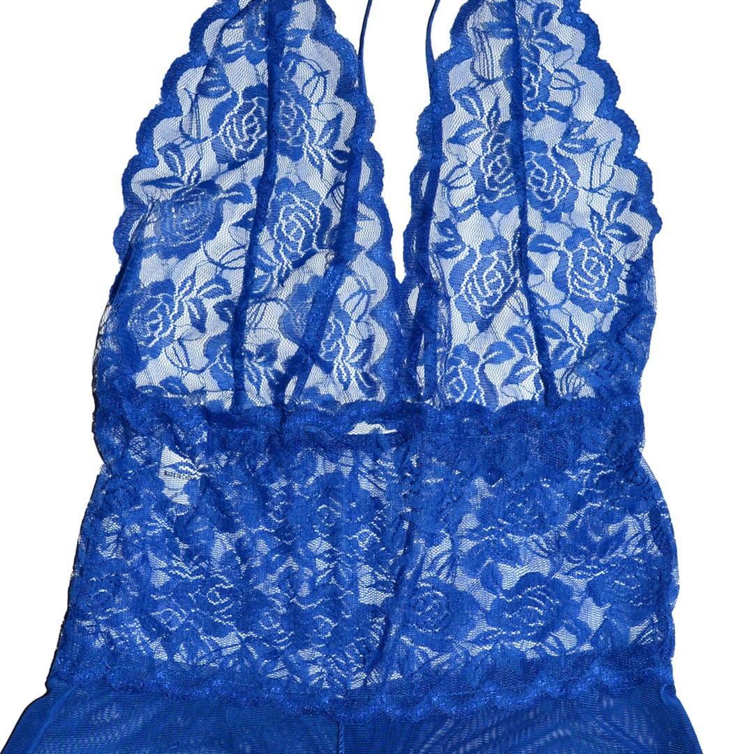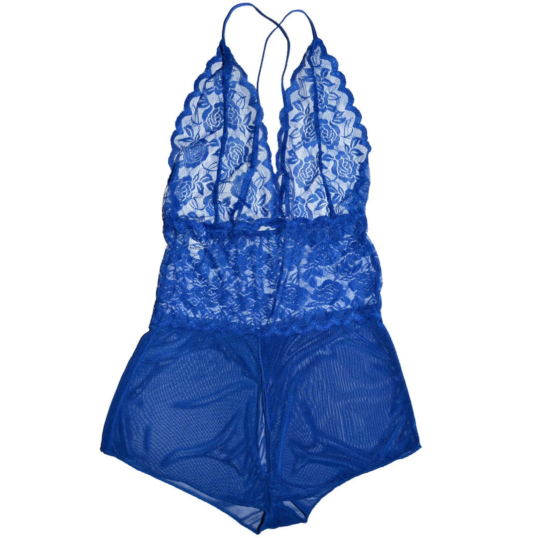 Синій еротичний напівпрозорий пеньюар "Боді" (комбінезон, ігровий костюм, костюм для рольових ігор) на тонких бретельках, що регулюються, перехрещених ззаду, подовжені чашки з квіткового мережива, широкий мереживний пояс, внизу напівпрозорі труси-шортики з вирізом спереду по центру.