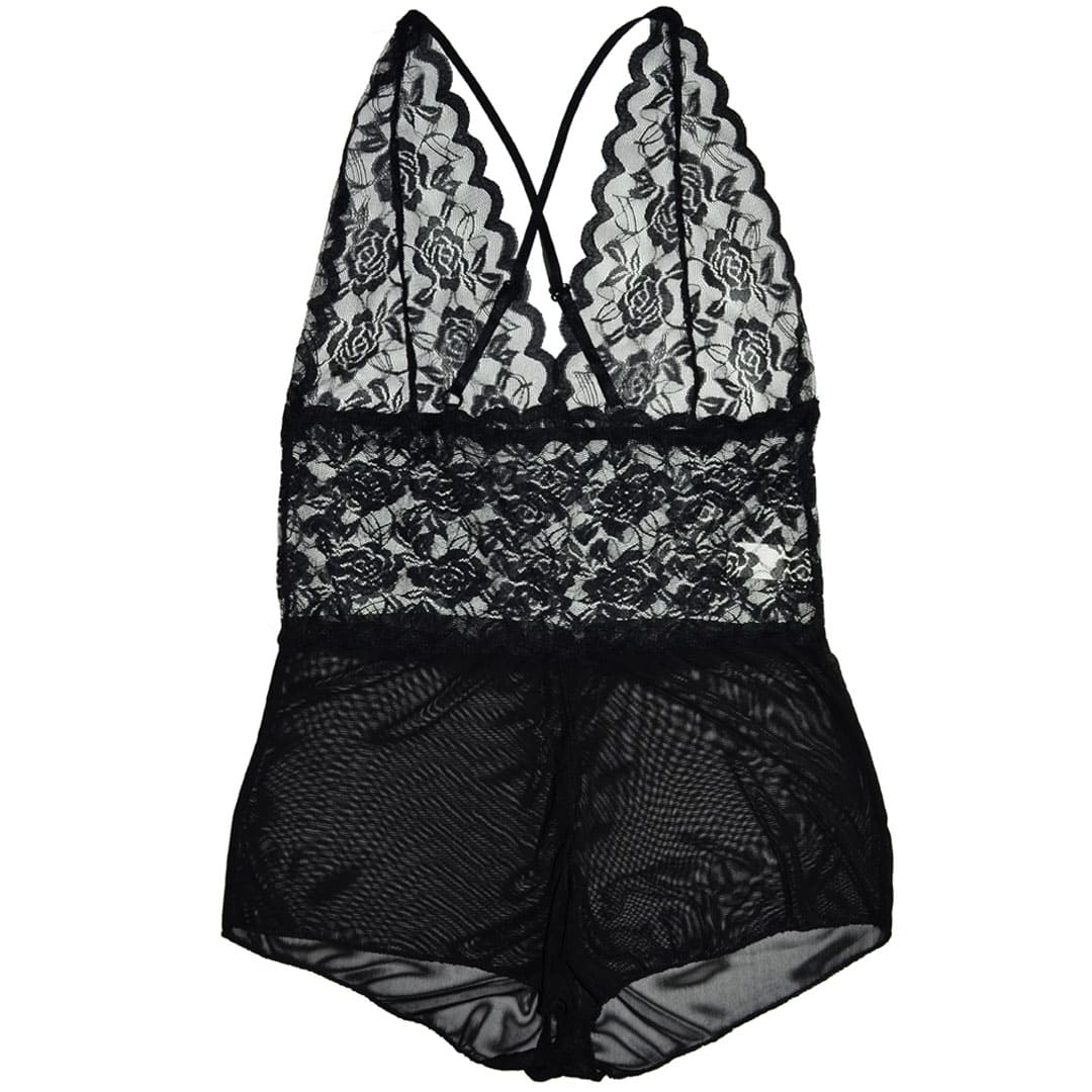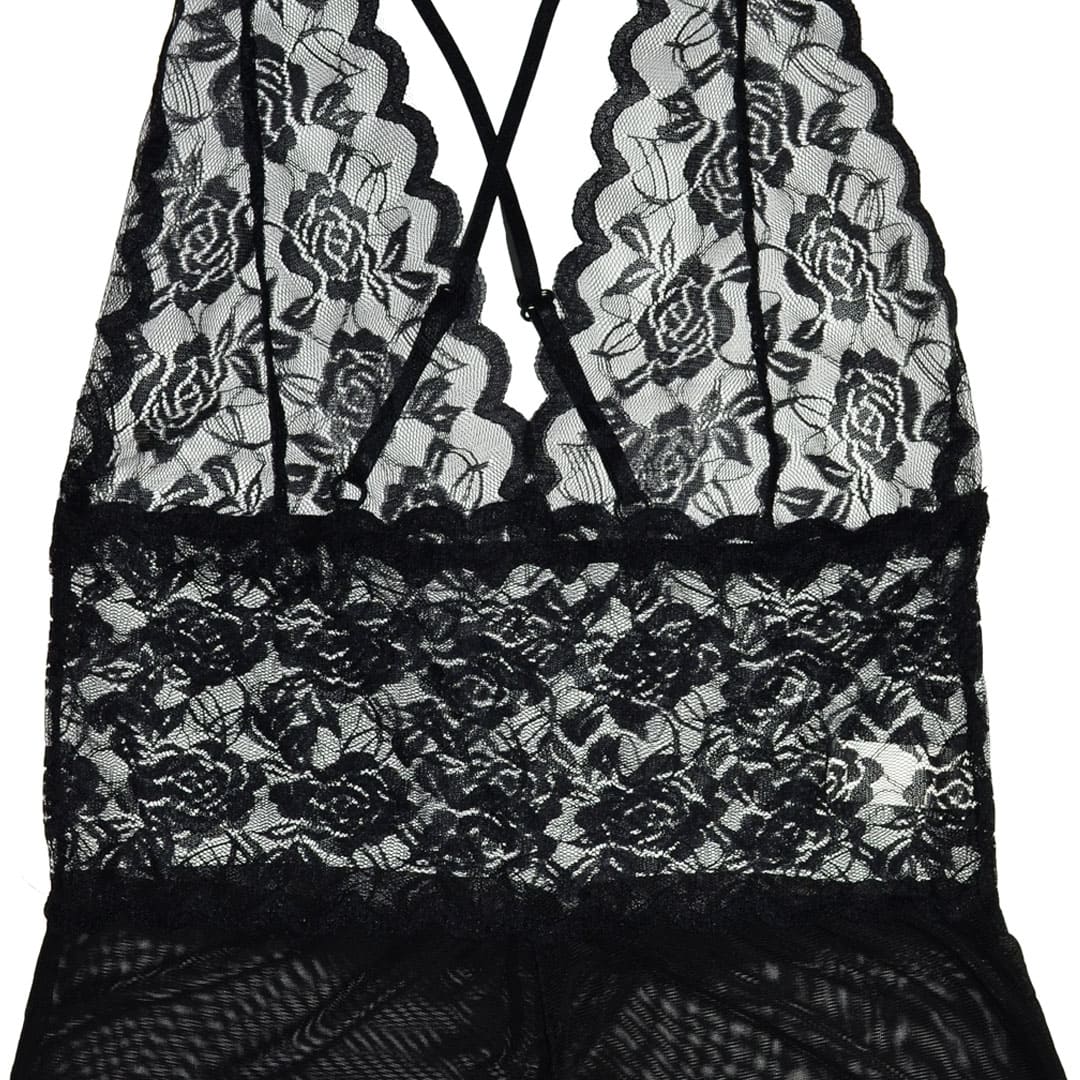 Чорний еротичний напівпрозорий пеньюар "Боді" (комбінезон, ігровий костюм, костюм для рольових ігор) на тонких бретельках, що регулюються, перехрещених ззаду, подовжені чашки з квіткового мережива, широкий мереживний пояс, внизу напівпрозорі труси-шортики з вирізом спереду по центру.