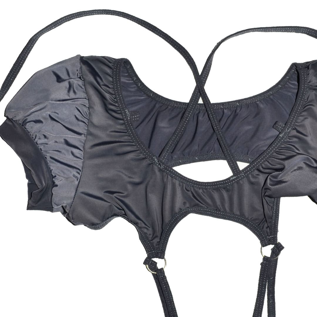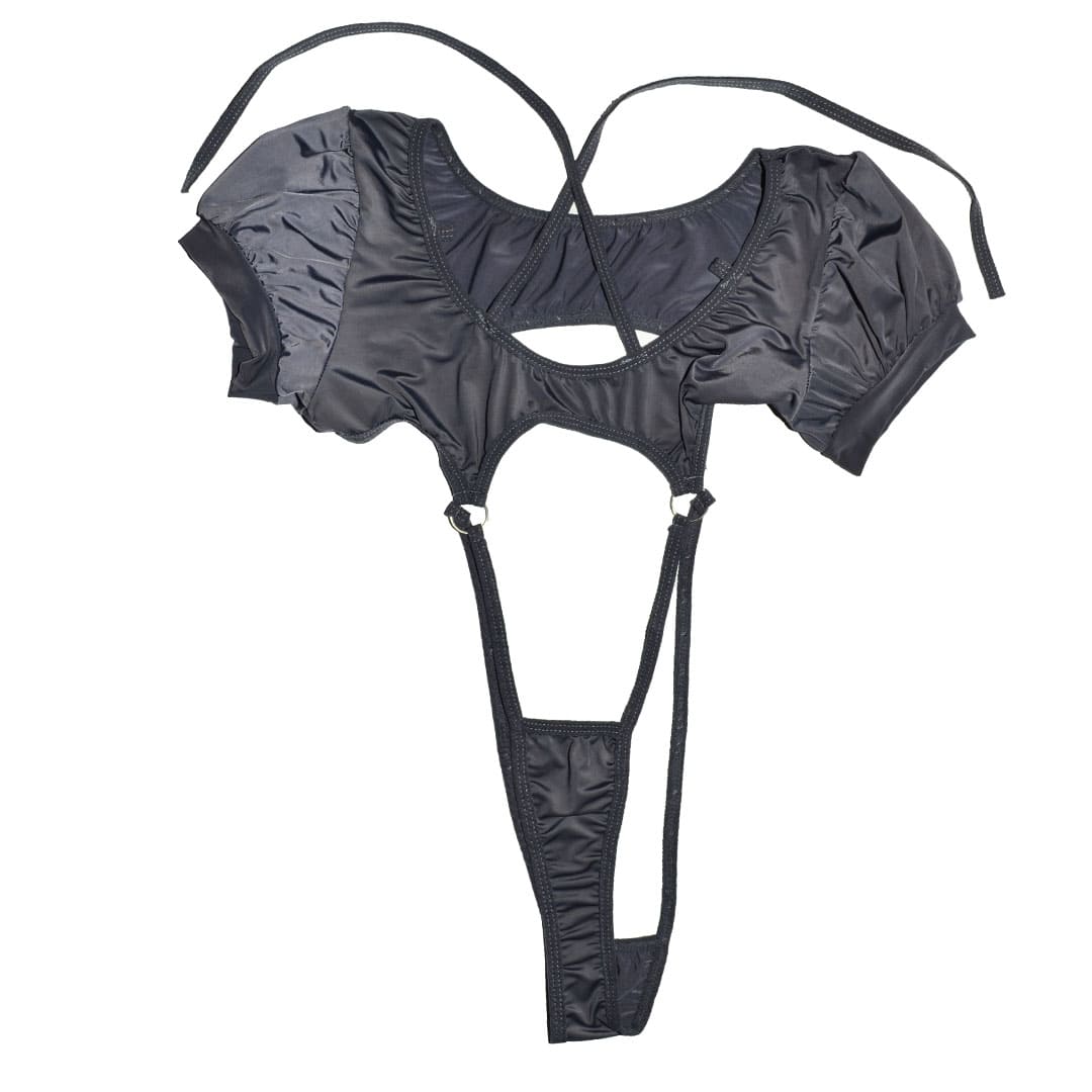 Сірий еротичний "Боді - Монокіні" (теді, ігровий костюм, костюм для рольових ігор) з еластичного глянсового матеріалу з коротким рукавами-ліхтариками та широким U-подібним вирізом горловини з декоративною шнурівкою (дві ринки та дві петельки з боків вирізу); кільцям, а внизу переходять у труси.