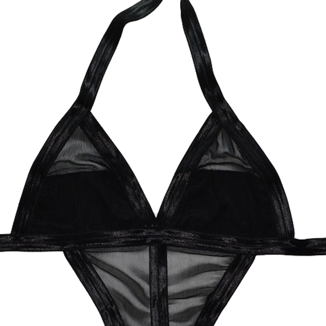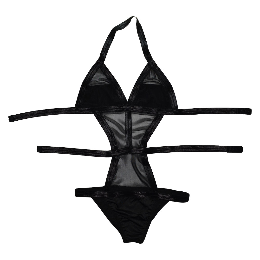 Еротичний "Боді-Монокіні" (теди, ігровий костюм, костюм для рольових ігор) з широких гумок, через шию з трикутними чашечками з непрозорою вставкою в нижній половині, від грудей спереду напівпрозора вставка переходить в труси, непрозорі труси танга, застібається ззаду на рівні грудей і талії на гумках по 1 гачка (3 варіанти).