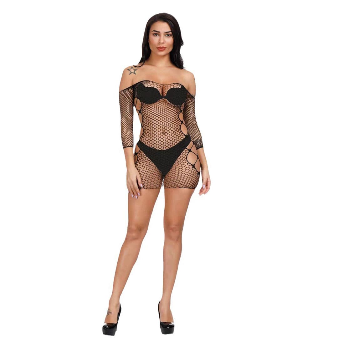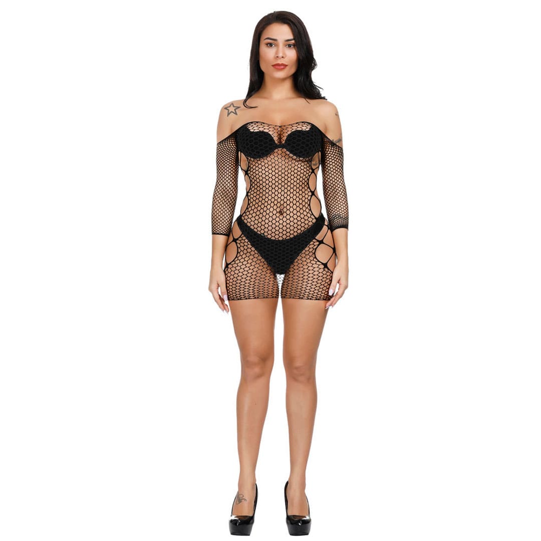 Еротичний прозорий короткий Пеньюар "Сітка" у ромбоподібну сітку з широким вирізом горловини та довгими рукавами, з боків вирізи кола.