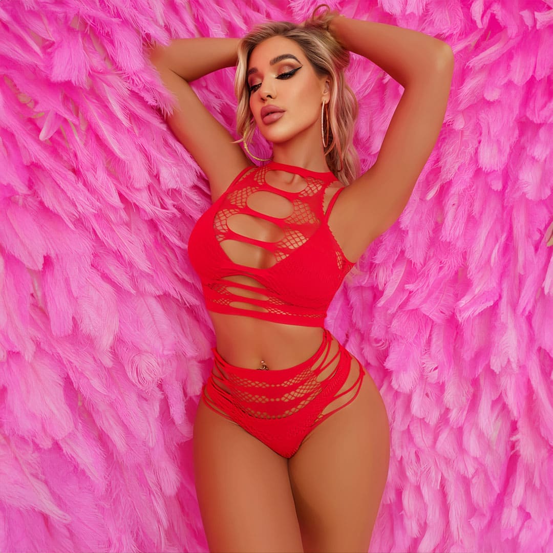 Красный эротический комплект (игровой костюм, костюм для ролевых игр) топ и трусы из ромбовидной сетки.