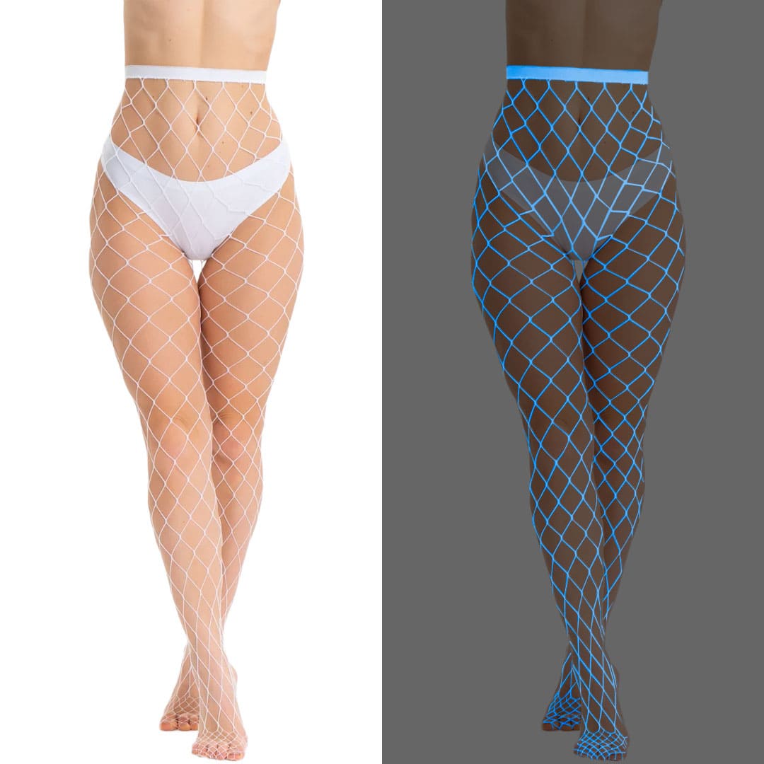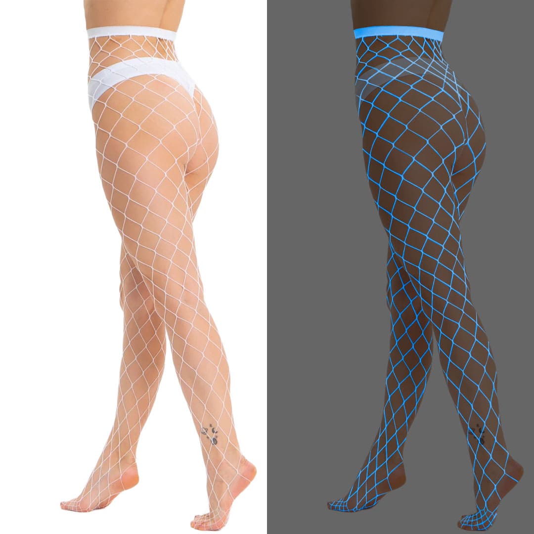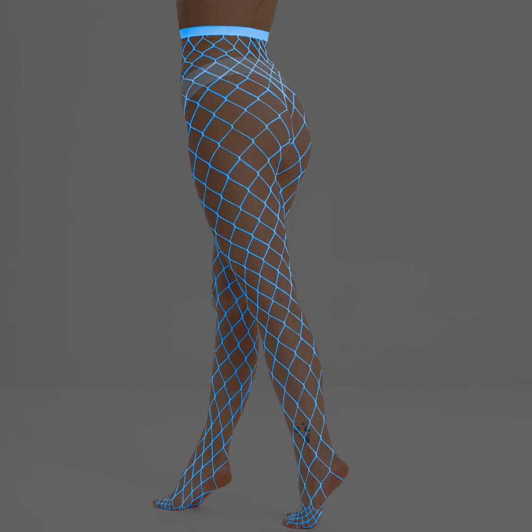 Колготки белые светящиеся в темноте голубым в крупную сетку с поясом-резинкой и с эффектом люминесценции (накапливает свет а потом светиться в темноте).